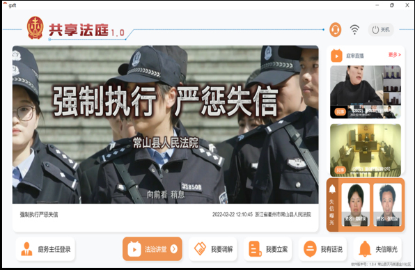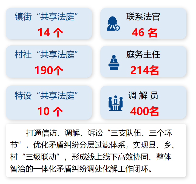 “共享法庭”是以数字化改革为抓手的数字化虚拟人民法庭,可以与基层治理中大量资源进行数字化对接,在注重共性的同时形成多部门、跨领域、积极协同下的个性化应用场景,为群众提供精准化的司法服务。截至目前,常山法院共设立“共享法庭”214个,其中特设“共享法庭”10个,“跨域”服务站2个,实现镇街、村社层面全覆盖。