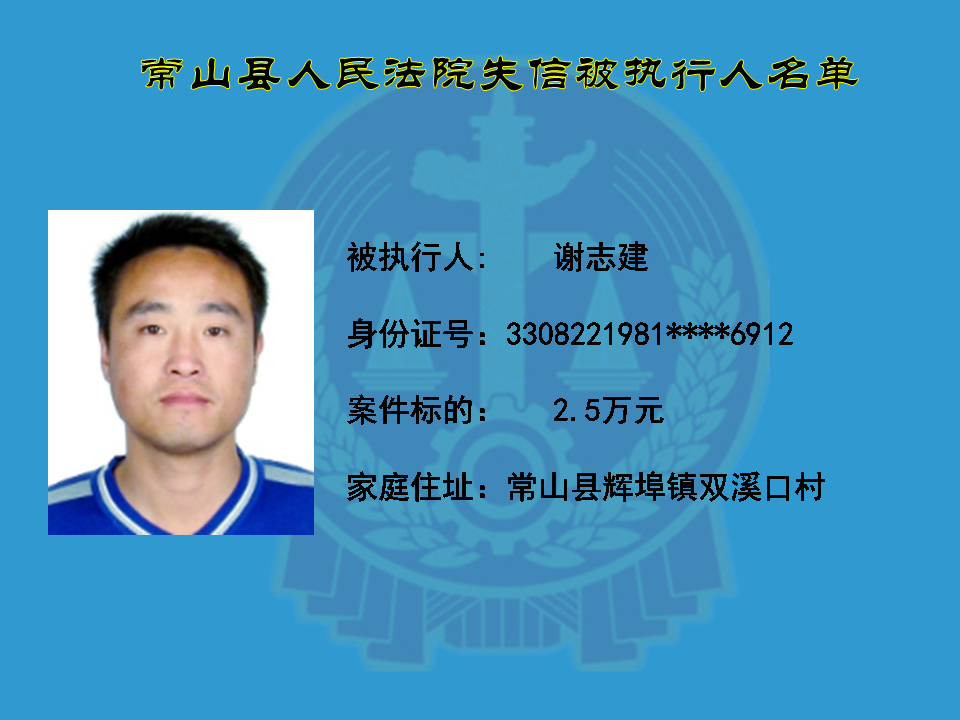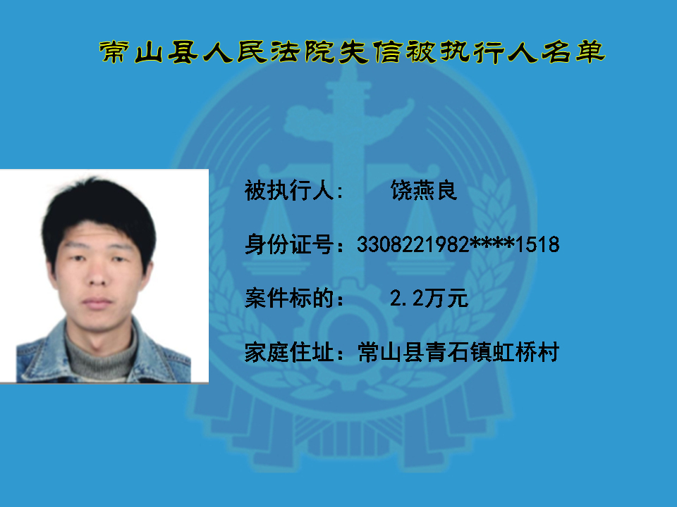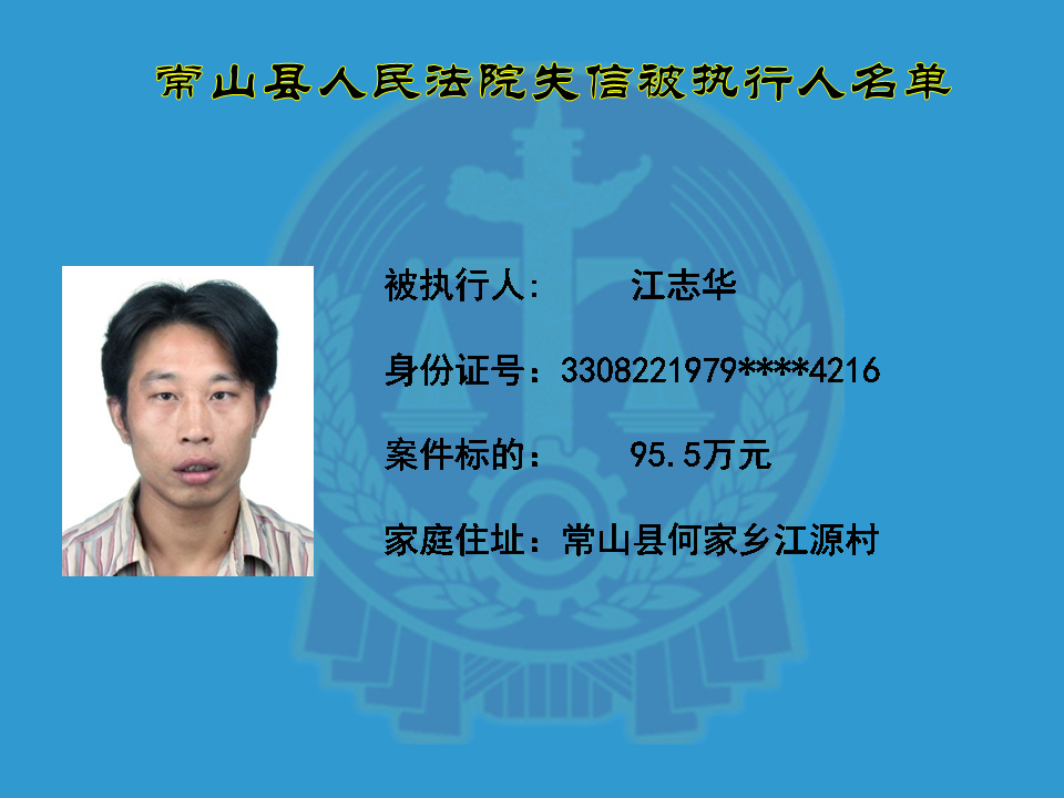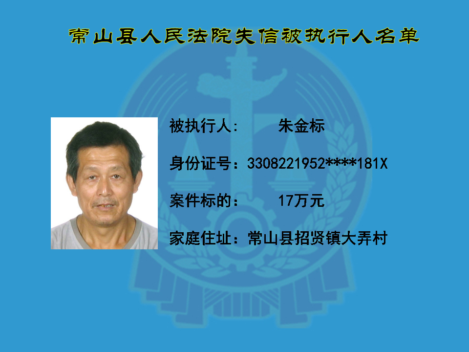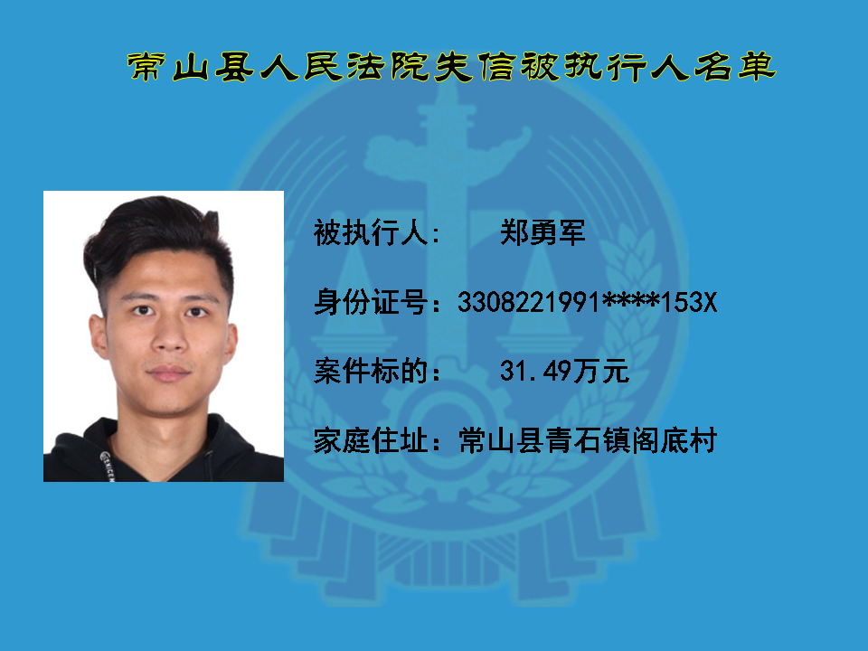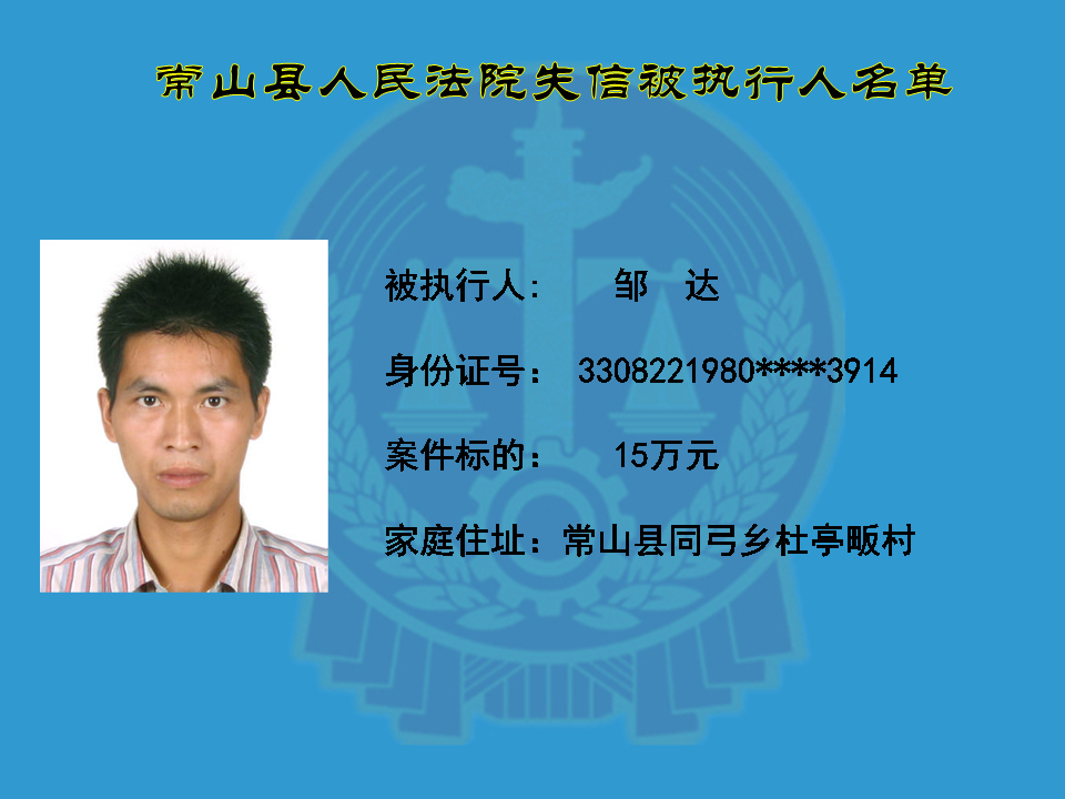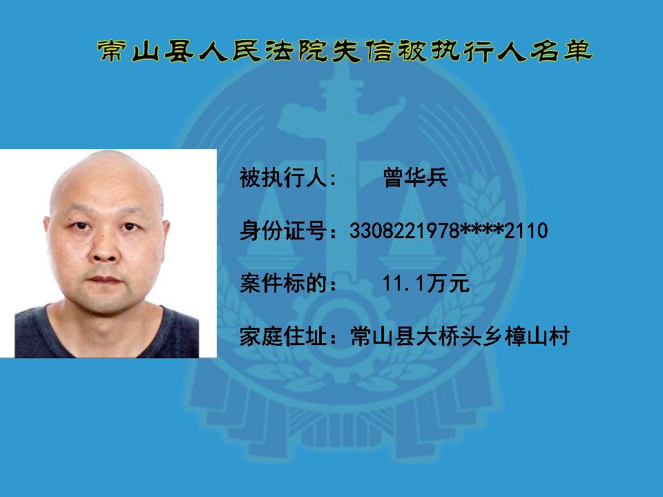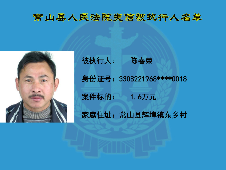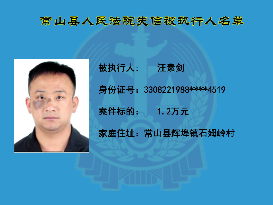 为维护司法权威,保护申请执行人的合法权益,使有履行能力但拒不执行法院生效裁判义务的失信被执行人受到信用惩戒。根据《中华人民共和国民事诉讼法》及相关法律的规定,常山县人民法院对下列失信被执行人进行曝光,希望知情人积极举报下列人员及其财产线索。
