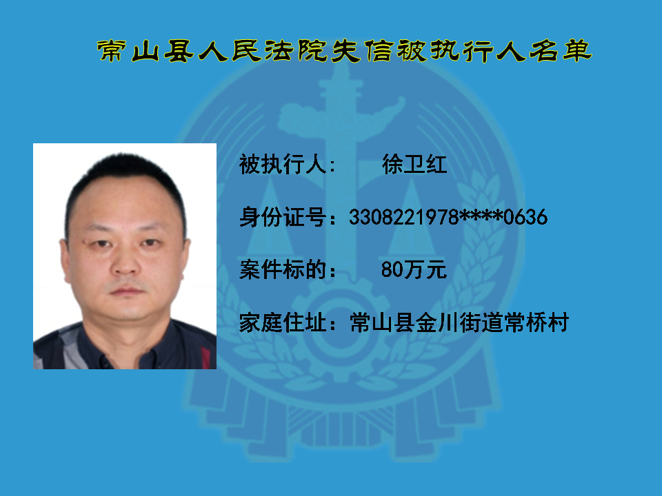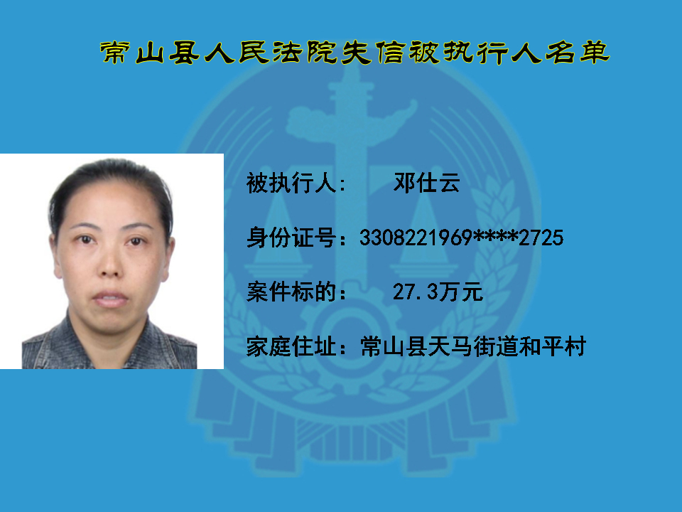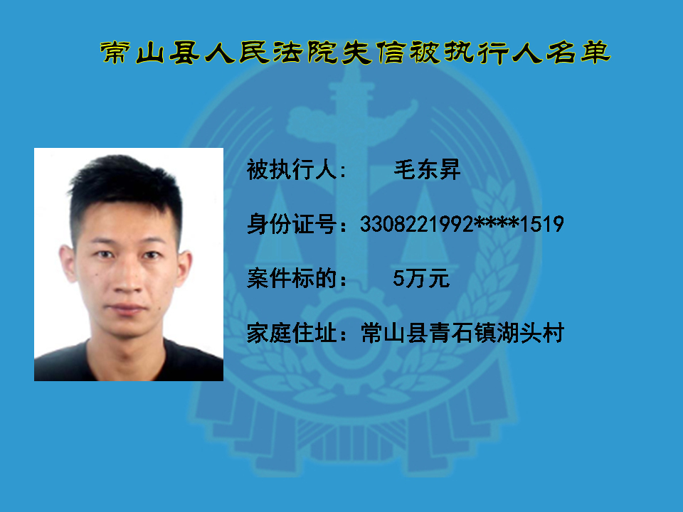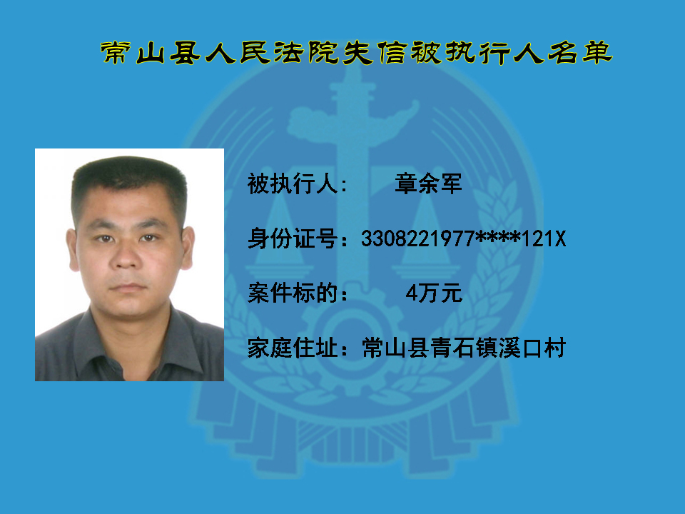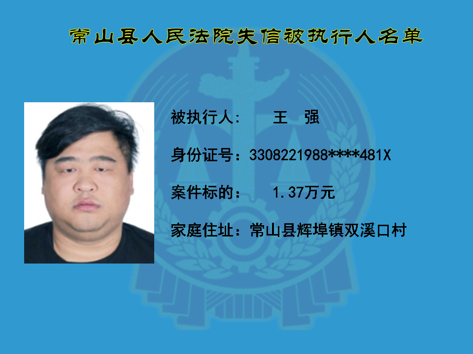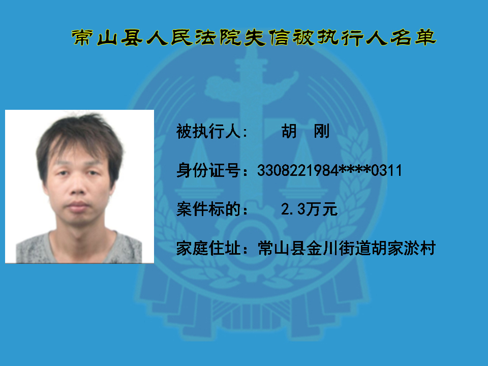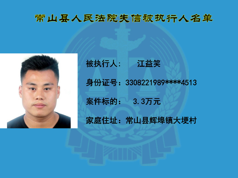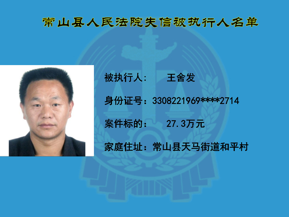 为维护司法权威,保护申请执行人的合法权益,使有履行能力但拒不执行法院生效裁判义务的失信被执行人受到信用惩戒。根据《中华人民共和国民事诉讼法》及相关法律的规定,常山县人民法院对下列失信被执行人进行曝光,希望知情人积极举报下列人员及其财产线索。