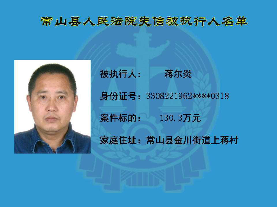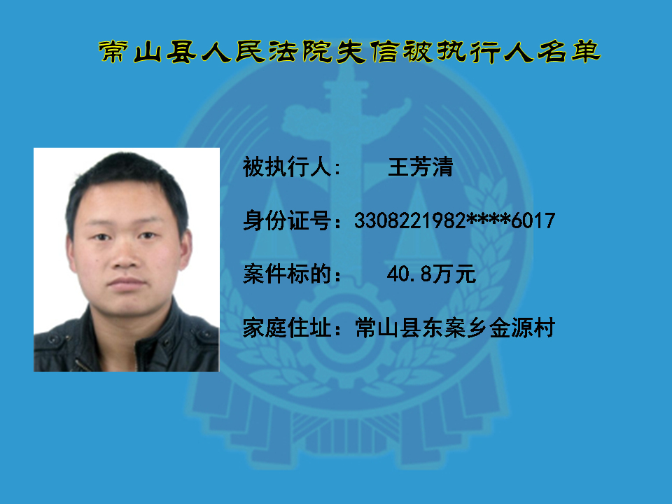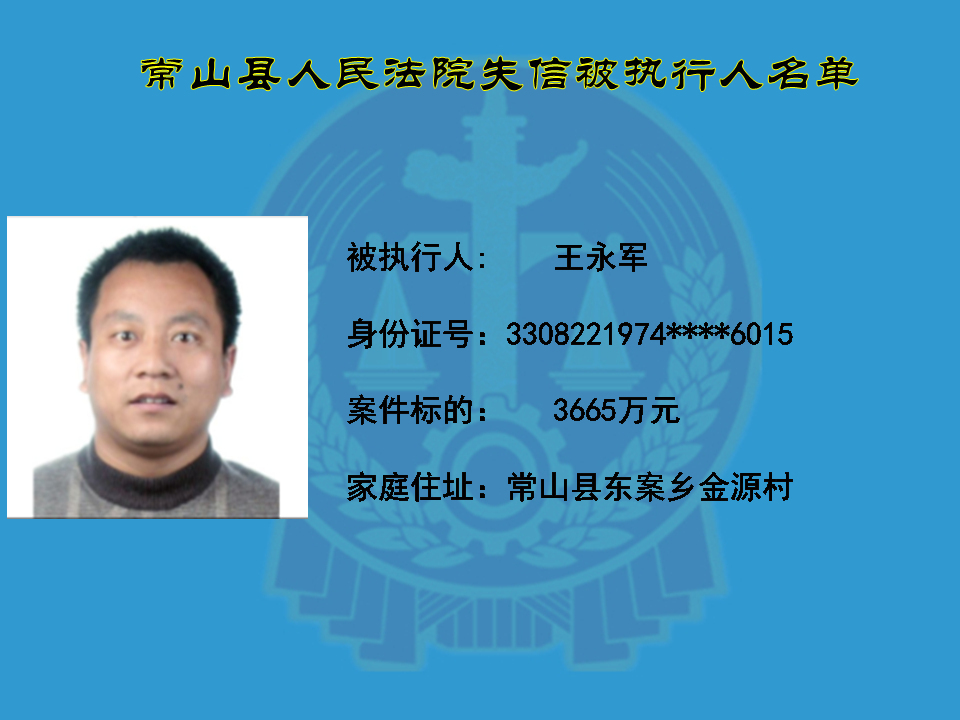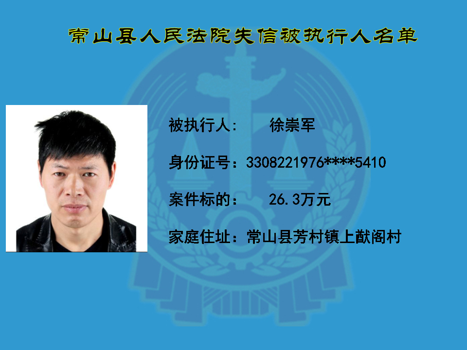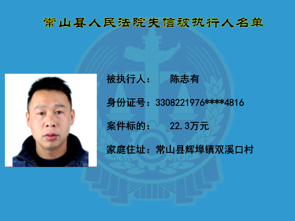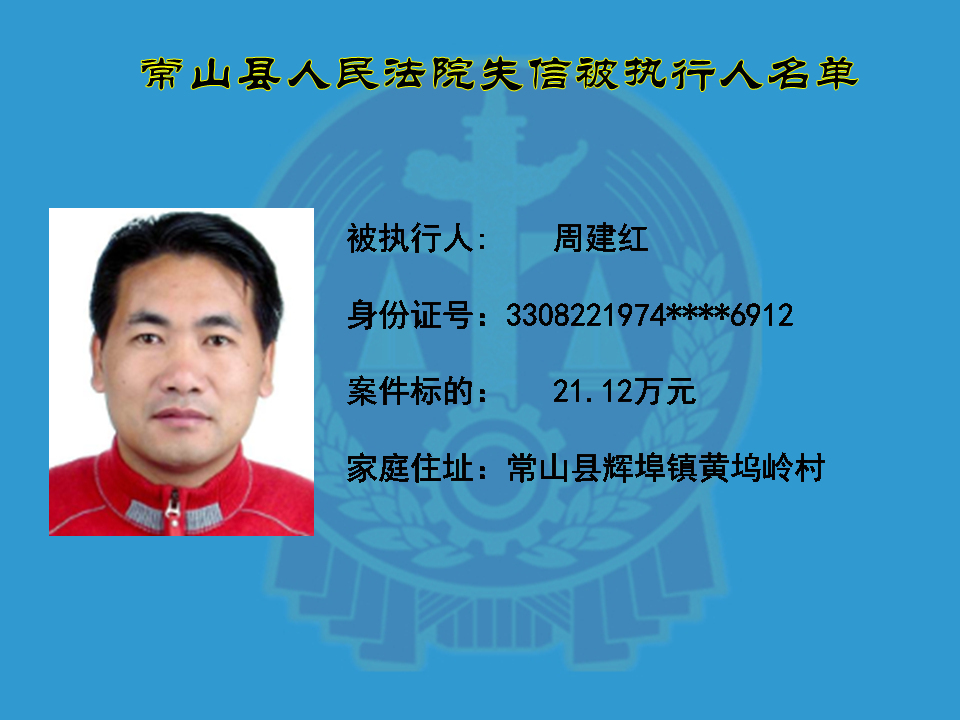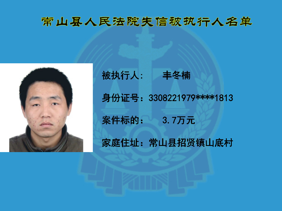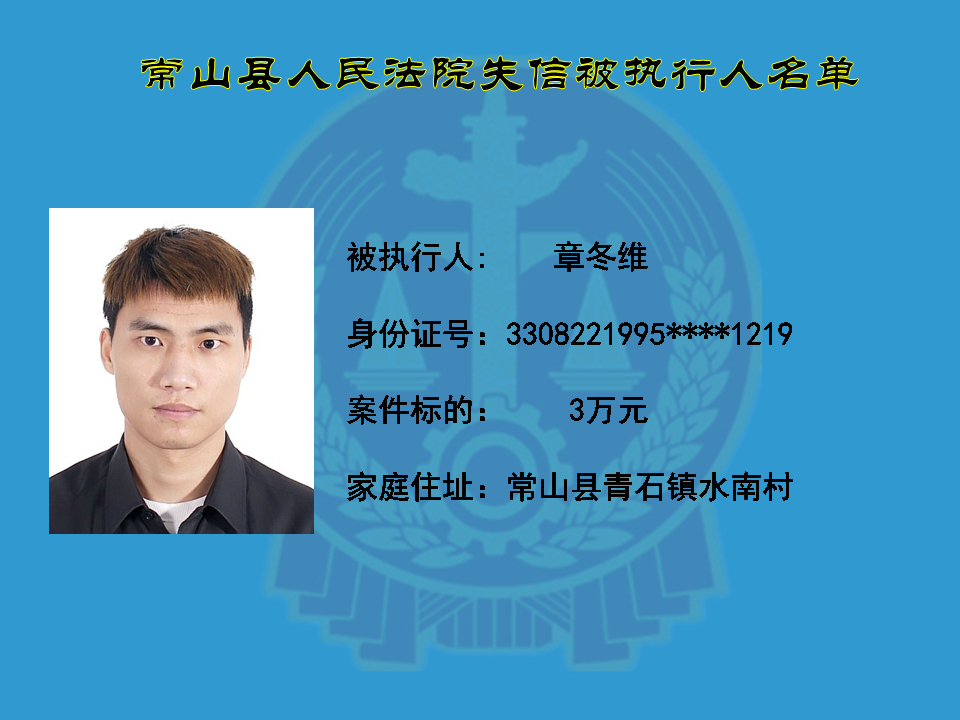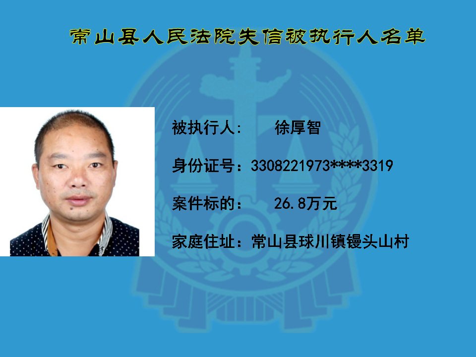 为维护司法权威,保护申请执行人的合法权益,使有履行能力但拒不执行法院生效裁判义务的失信被执行人受到信用惩戒。根据《中华人民共和国民事诉讼法》及相关法律的规定,常山县人民法院对下列失信被执行人进行曝光,希望知情人积极举报下列人员及其财产线索。