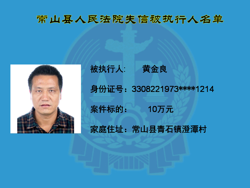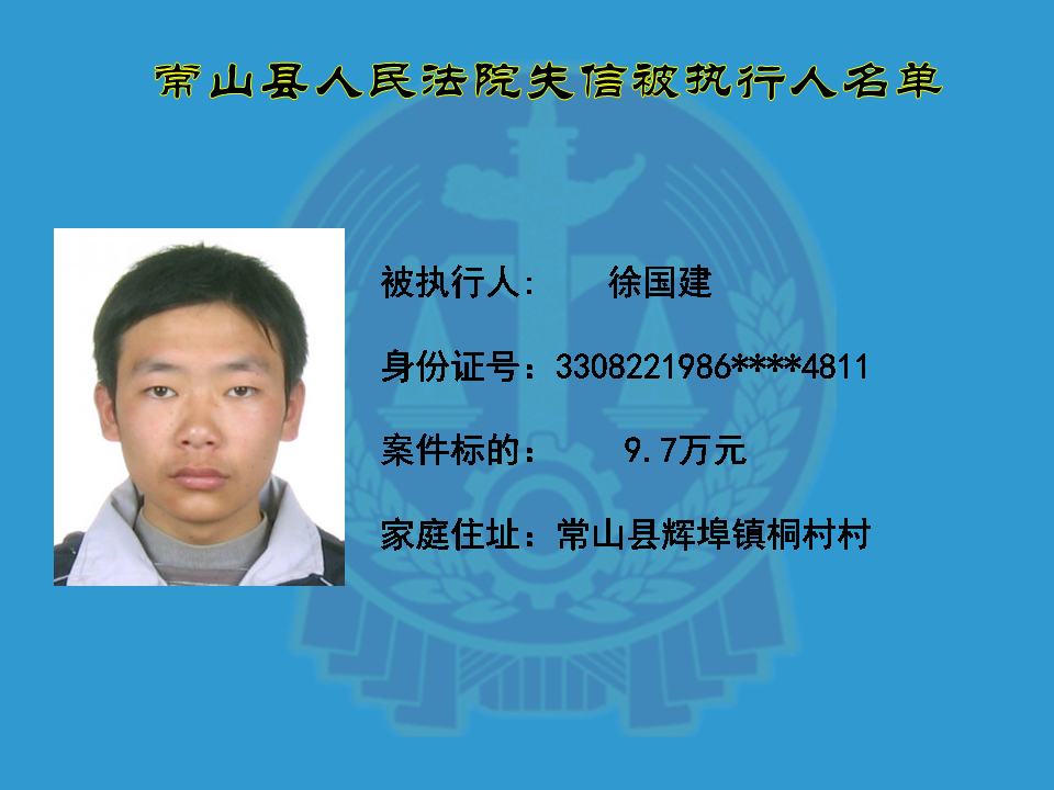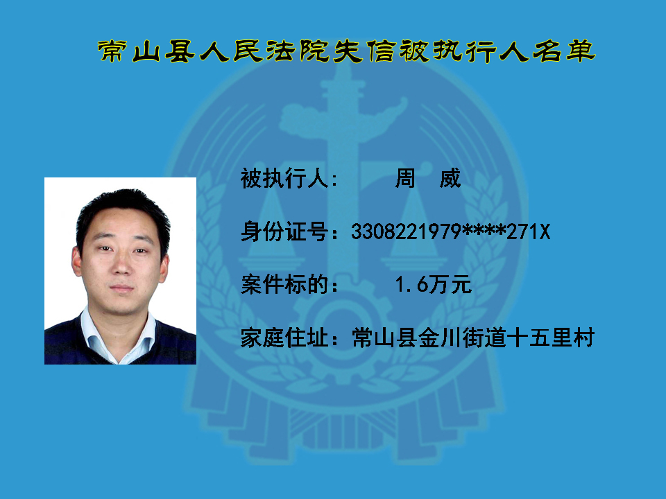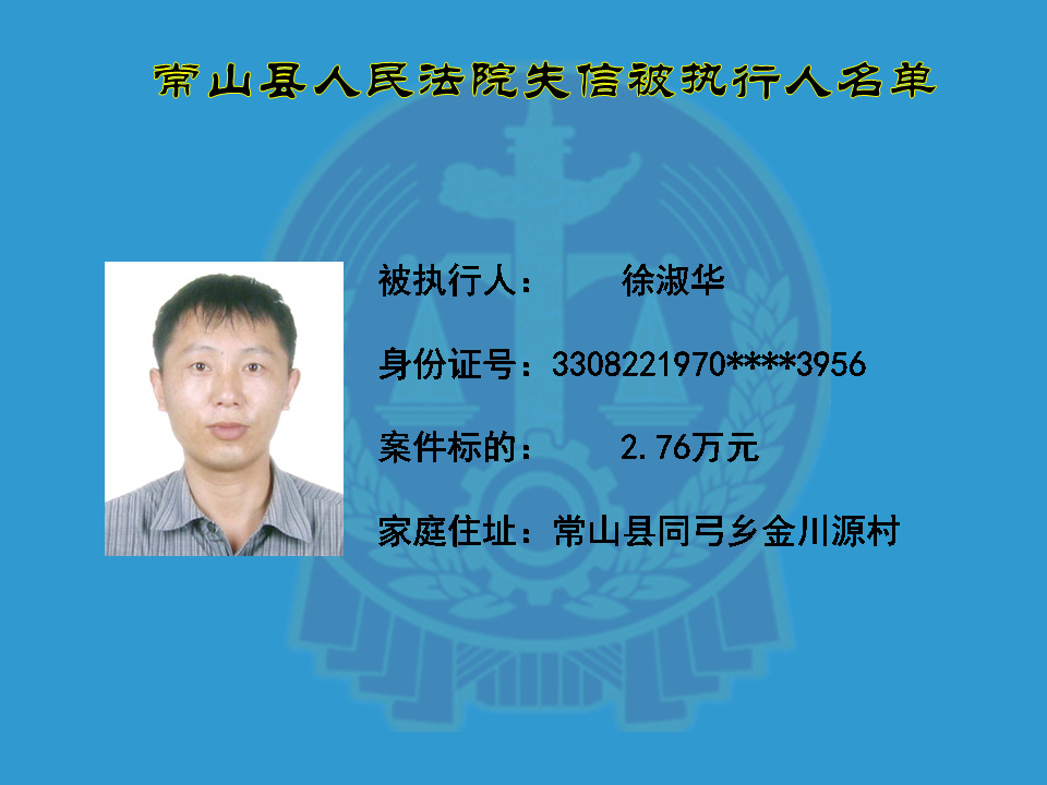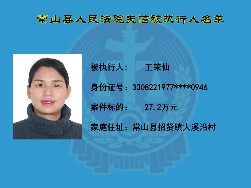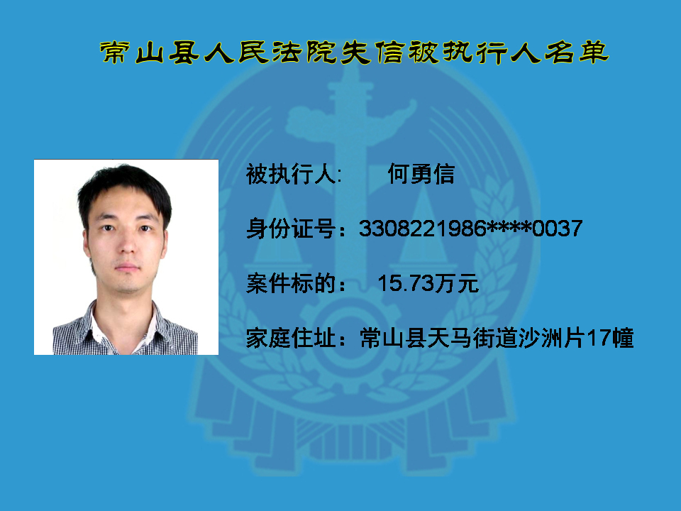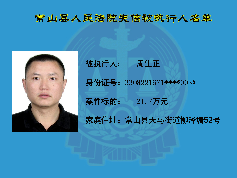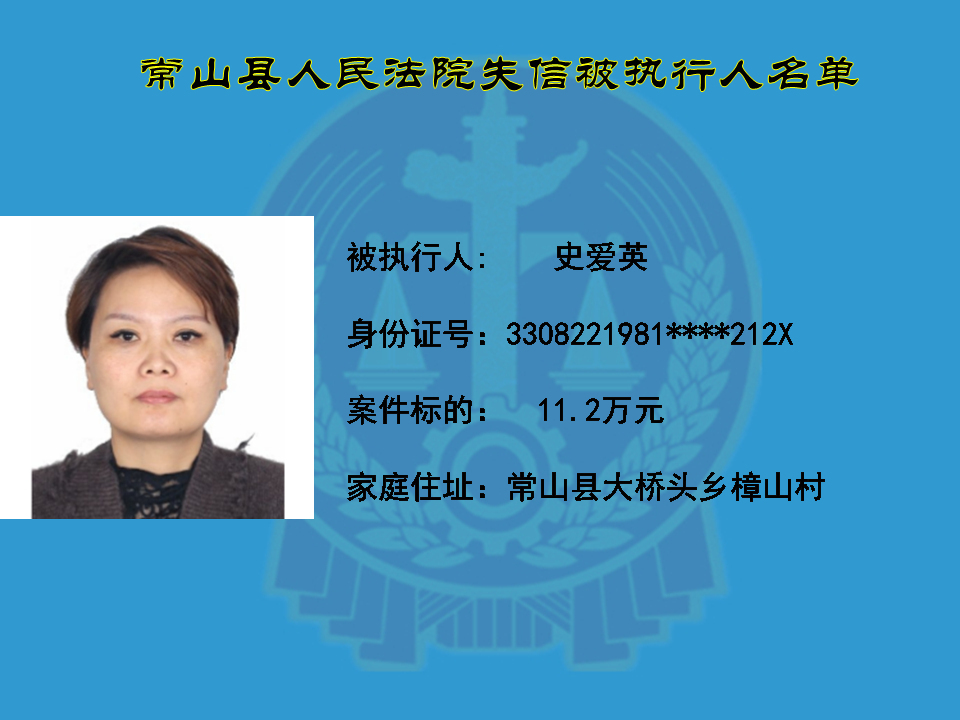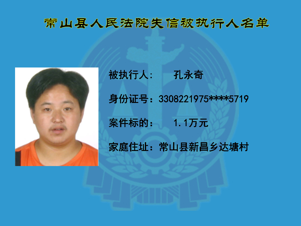 为维护司法权威,保护申请执行人的合法权益,使有履行能力但拒不执行法院生效裁判义务的失信被执行人受到信用惩戒。根据《中华人民共和国民事诉讼法》及相关法律的规定,常山县人民法院对下列失信被执行人进行曝光,希望知情人积极举报下列人员及其财产线索。